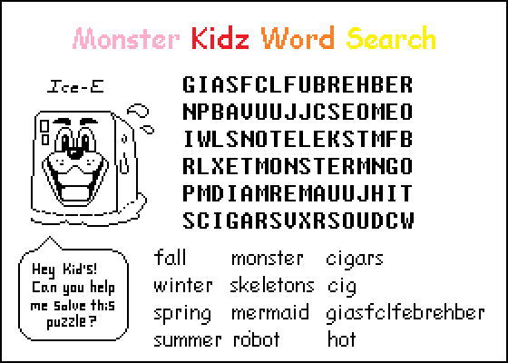 Le Petit Monstrez Word Search est un jeu de "mots-mêlés" que Sans met en place pour piéger le protagoniste. Le jeu présenter un cube de glace ayant une tête d'ours, et nomme "Ice-E", qui est, selon Toby Fox, "the greatest and most popular Undertale character" (Le meilleur personnage d'Undertale, et le plus populaire)[1]. Avec certaines valeurs de "fun", il peut également comporter un bonhomme de neige avec une tête d'ours appelé "Nightmare" (Cauchemar). Si le protagoniste tente de quitter ce puzzle, Papyrus se plaindra que Sans ait fait un puzzle trop compliqué.