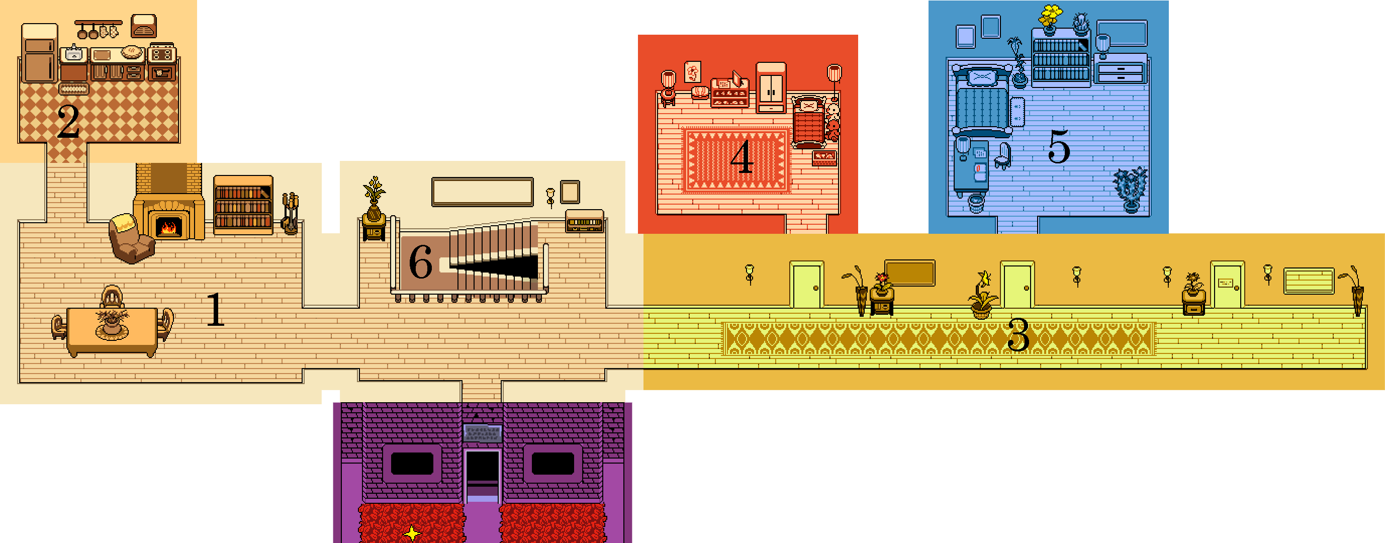 Toriel amène le protagoniste à la chambre d'ami et la lui confie. C'est une chambre d'enfant, dont les éléments semblent prouver que d'autres enfants y ont vécu avant, comme des chaussures de tailles variées, bien que Toriel aurait pu préparer cela pour accueillir n'importe quel type d'enfant humain qui arriverait. Éteindre la lampe en haut à gauche assombrit la chambre et change la musique en version "boîte à musique" de Home.