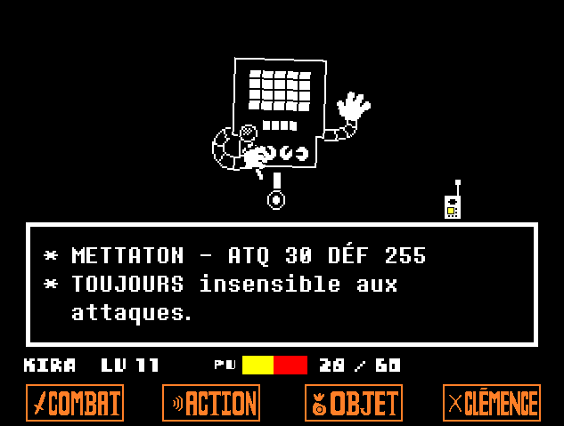 - Dans Undertale v1.001, les stats de Mettaton dans sa forme de boîte sont passées de "10 ATK 999 DEF" à "ATK 30 DEF 255".