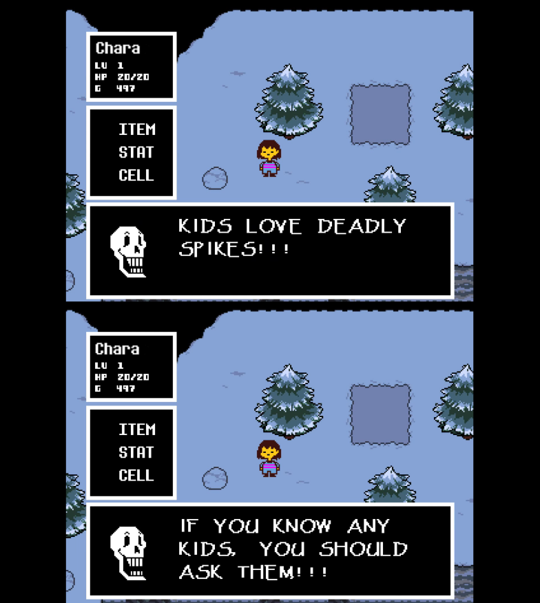 Sûrement dû au fait qu'il n'ait jamais vu d'humain aurapavant, Papyrus n'est pas au courant du fait que le protagoniste soit un enfant. En effet, appeller Papyrus dans la salle où Cannisse et Canibelle sont rencontrés fera dire à Papyrus qu'il est en désacord avec la décision d'Asgore de banir les piques des puzzles, ceux-ci étant dangereux pour les enfant. Papyrus dit à l'humain que les enfant "adorent les piques mortels", et demande au protagoniste de confirmer ça auprès d'un enfant, sans réaliser que le protagoniste en est un.