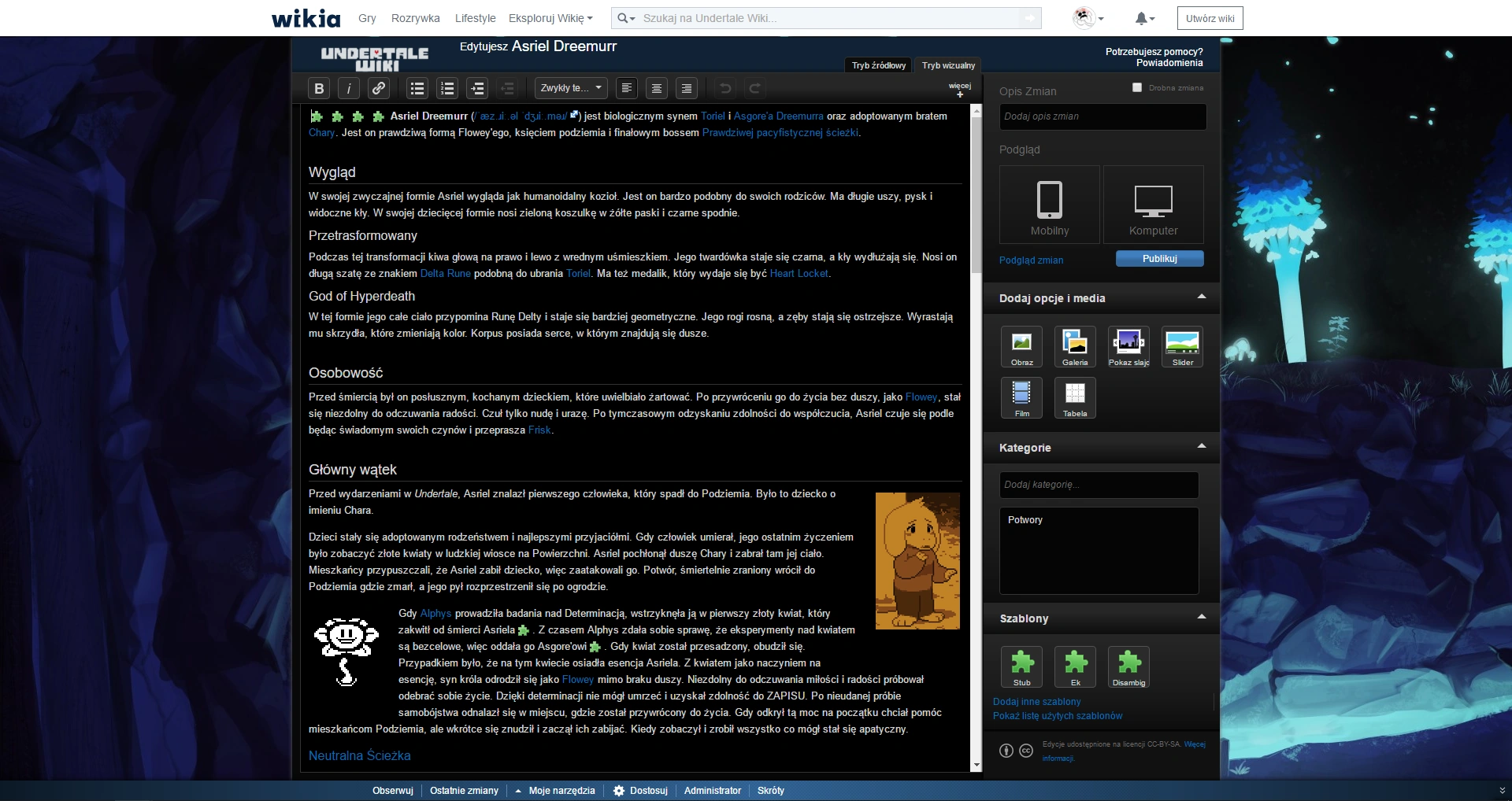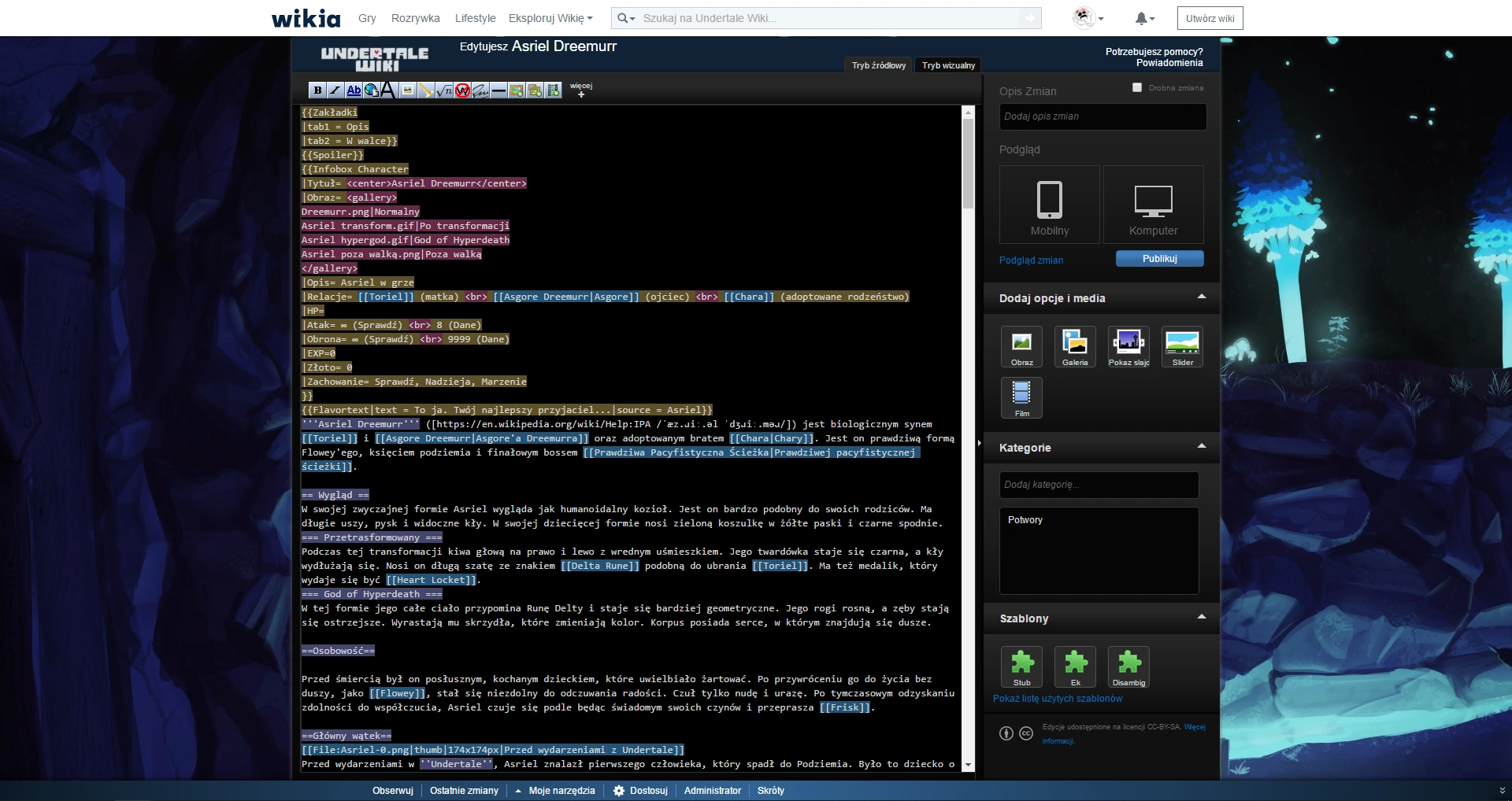 Na Undertale Wiki dostępne są trzy edytory: edytor źródłowy, klasyczny edytor wizualny i VisualEditor. Dwa ostatnie to tzw. WYSIWYG (what you see is what you'll get - to co widzisz jest tym, co otrzymasz). O ile sprawiają wrażenie łatwych w obsłudze i przyjemnych, o tyle mają kilka większych minusów - nie działają we wszystkich rodzajach stron (użytkownik posługujący się nimi nie poradzi sobie z edycją szablonu) oraz są znane z niszczenia kodu stron. Poza tym, strony o rozbudowanym kodzie często nie mogą być edytowane w tychże narzędziach - są dla nich "za ciężkie".