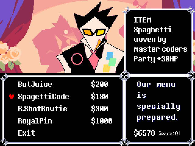 Спагетти-код (англ. Spaghetti Code) — расходуемый предмет в Deltarune, который продаёт Свотч в своём кафе в особняке Королевы.