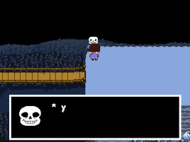 - When encountering Sans, he is disturbed by the fact the protagonist does not react to his joke. He then attempts to hide them behind the conveniently shaped lamp, but they ignore him. When Papyrus arrives, he immediately leaves after Sans tells him he found a human, not noticing the protagonist. Sans then tells the protagonist that they should continue "pretending" to be a human.[4]