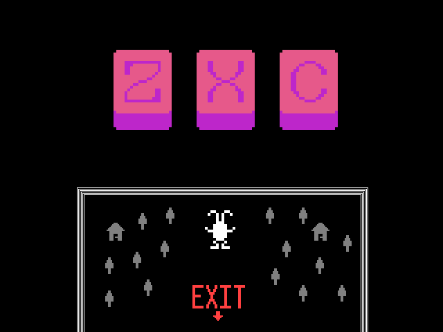 The control test has large Z, X, and C button icons at the top, which become "pressed" and play a sound if the gamepad is configured correctly and the corresponding button is pushed. The corresponding sounds are originally from the Roland TR-909 drum machine. In the Bullet Board below, the player has control over one of Migosp's attacks, which animates when a button press is detected. The Bullet Board also contains what appears to be trees and houses, although these objects do not have collision boxes.