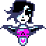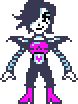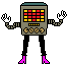 He has a pink chest piece, a narrow metallic waist with a box contraption, and black shoulder pads above his segmented arms, which end in gloves. The chest piece has what appear to be a speaker and some knob or gauge, while the waist has two parts that seem to act as a locking mechanism that holds his "heart-shaped core," as they both lose white pixels during his "heart-to-heart" attack. His long black-clad legs end in pink high-heeled boots.