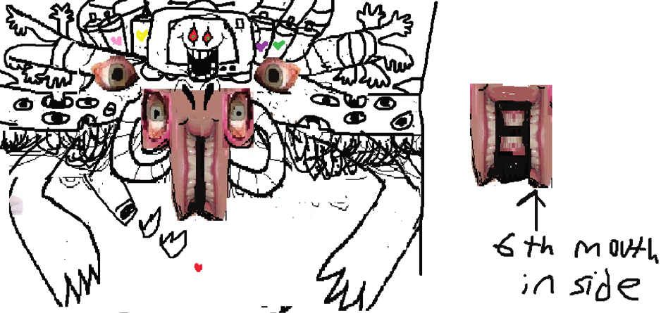 The middle of his body has a contorted, distorted and abnormal human face with two mandibles on the bottom and a TV monitor on top. The monitor either displays a laughing and cartoonish pixelated face, or a black and white image of a yelling and distorted human face, presumably of Toby Fox himself.[1] The pixelated face has sideways eyes that flash red and green, and a big mouth with large, blocky teeth. The face can also escape the screen when it laughs, as the mouth seems to pop out of the bottom.