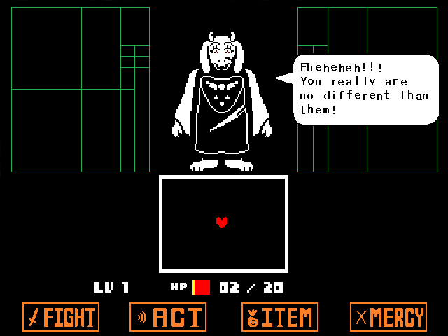 - ↑ You... ...at my most vulnerable moment... To think I was worried you wouldn't fit in out there... Eheheheh!!! You really are no different than them! - Toriel