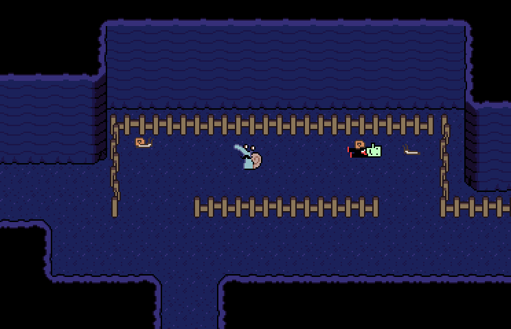 The northern exit leads to a room with a wooden bridge and dark water in which many Water Sausages grow. On the north wall are many ancient glyphs. At the end of the wooden dock, the protagonist steps on a small raft that drifts to the right.