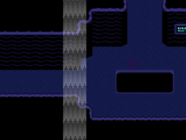 After progressing right, the protagonist encounters a puzzle that involves dodging rocks that are going down the waterfall as well as a Dimensional Box. If a rock pushes the protagonist over the edge of the waterfall, they land on a wooden bridge that has an Echo Flower on the rightmost end.[3] Backtracking to the left allows the protagonist to attempt to cross the waterfall again or access the hidden room behind the waterfall. The Old Tutu resides in this hidden room.