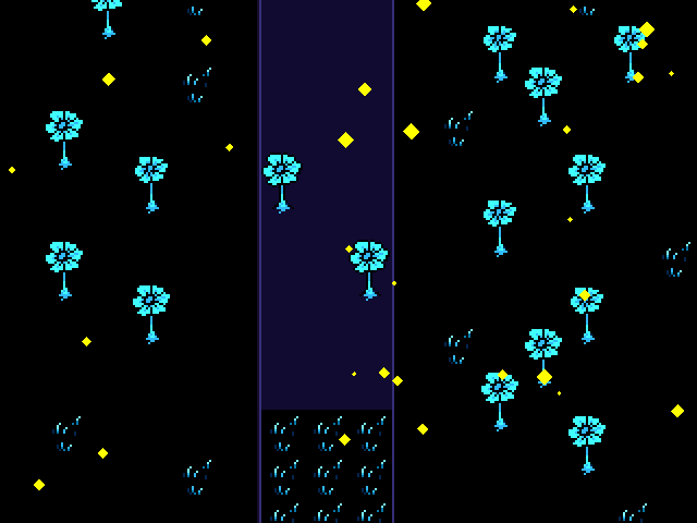 Going south of where "Loren" is leads to a room that spans a large area horizontally and vertically. The color palette reverses in this room, and the water appears bright blue while the land appears black. As the protagonist traverses this room, they encounter a few Echo Flowers and can also find the Ballet Shoes in a tuft of tall grass.[10]