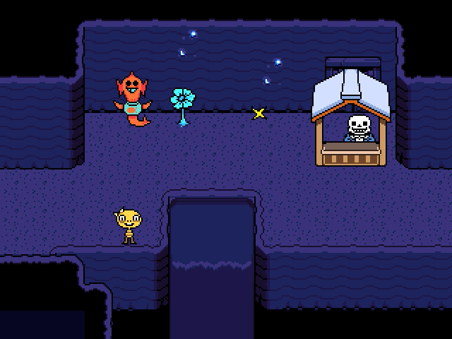 In the "Checkpoint", the protagonist speaks to Monster Kid, Sans, and the Echo Flower Explainer. A small waterfall flows through this room, and an Echo Flower and Sans's sentry station are against the north wall. Between Sans's sentry station and the Echo Flower is a SAVE Point. Snow covers Sans's sentry station and his station blocks access to a wooden door. From this room, the protagonist can go with Sans to Grillby's via a shortcut through the right wall.