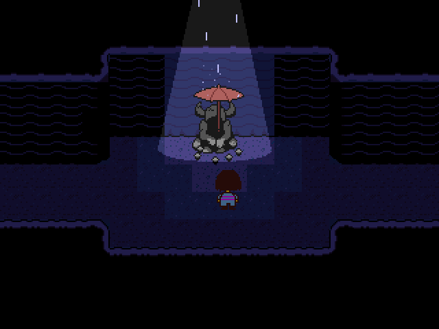 右方的出口會通往一個有一道白色瀑布、一桶雨傘和一個鼓勵主角拿把雨傘的告示牌的房間。繼續往右走會進入淹水的房間,有著許多道瀑布和水池。這段時間內怪物小孩會跟著主角。