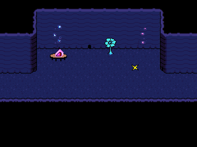 房間裡有一些紅色和藍色的寶石,還有三個石筍位於Undyne附近。主角從草叢右邊爬出來後,怪物小孩會跟著出來,並慶祝說終於看到Undyne了。