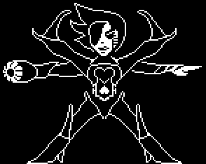 他右臂的前端被某種類似於某種形式的槍枝所取代,而他的雙肩都加上了和他套裝相配的護肩。他腰上的心形圖案或者說靈魂圖樣更接近怪物的版本,而他胸前還有另外一個心形圖示,就和Undyne一樣。